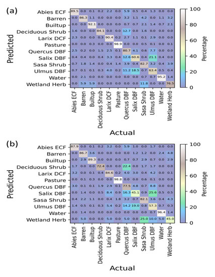 Performance of the ultra-resolution suite (a) over the very high-resolution suite (b) for the differentiation of land cover and vegetation types in the Zao site using bi-seasonal images.