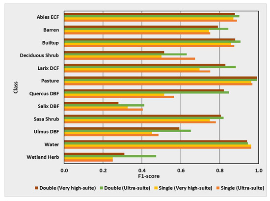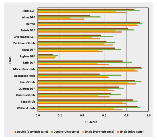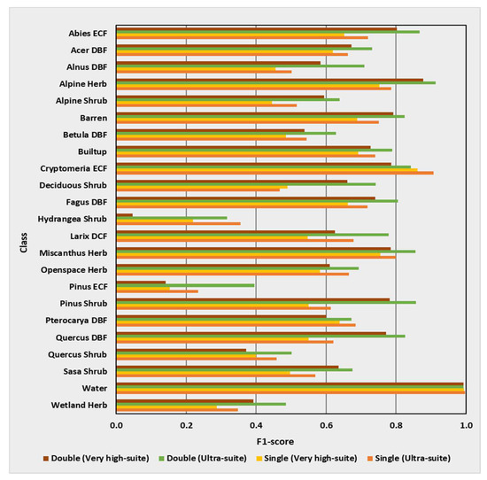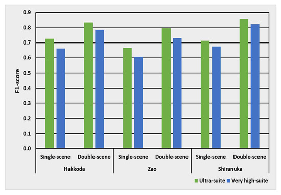 The performance of the two categories of features extraction and mapping suites (ultra-resolution and very high-resolution suites) is summarized and shown in Figure 15. It is based on the 10-fold cross-validation accuracy (F1-score) using the SoftVoting classifier. For the case of single-date autumn images, the ultra-resolution suite provided 6.3% more accuracy (F1-score) than the very high-resolution suite in the Hakkoda site with 16 land cover and vegetation classes. In the Zao site with 23 classes, the ultra-resolution suite provided 6% more accuracy (F1-score) than the very high-resolution suite. For the classification of 12 classes in the Shiranuka site, the ultra-resolution suite provided 3.6% more accuracy (F1-score) than the very high-resolution suite. On average, the ultra-resolution suite provided 5.3% more accuracy (F1-score) than the very high-resolution suite across the three sites. A similar trend was obtained by using bi-seasonal images (summer and autumn). In the case of bi-seasonal images, the ultra-resolution suite provided 4.9% more accuracy in the Hakkoda site, 6.8% more accuracy in the Zao site, and 3% more accuracy in the Shiranuka site over the very high-resolution suite. On average, the ultra-resolution suite showed 4.9% higher performance than the very high-resolution suite using bi-seasonal images across three sites.