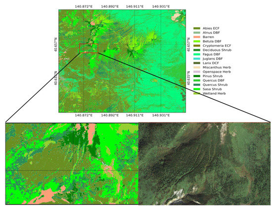 In Figure 17, the zoomed-in map (bottom left) shows the distribution of Abies ECF (olive color) and Pinus Shrub (dark green) among the Sasa Shrub (lime color) with built-up areas (red color). This distribution is well matched with the true-color composite image (bottom right). The dark green trees are Abies ECF and Pinus Shrub in the true-color composite image, whereas the light green shrubs are Sasa Shrub.