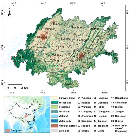 The Chengdu-Chongqing economic circle is located at the intersection of the Belt and Road and the Yangtze River Economic Belt, which has unique geographical advantages. As one of China’s important strategic deployments, it is the region with the densest population, richest resources, fastest urbanization, and highest degree of openness in the west. In 2020, the urbanization rate of the Chengdu-Chongqing economic circle was only 55.74%, and it differed markedly from the other three major urban agglomerations in China. As early as 2016, the urbanization rates of the Pearl River Delta urban agglomeration, the Yangtze River Delta urban agglomeration, and the Beijing-Tianjin-Hebei urban agglomeration had already reached 84.49%, 61.44%, and 59.82% respectively. This suggests that a large proportion of UFAs created by urbanization in the future will be located in the study area. Hence, the Chengdu-Chongqing economic circle would be an ideal case study area for identifying UFAs. Figure 1 shows the scope of the study area. To ensure regional connectivity, Shizhu Tujia Autonomous County and Pengshui Miao Tujia Autonomous County were included in the study region.