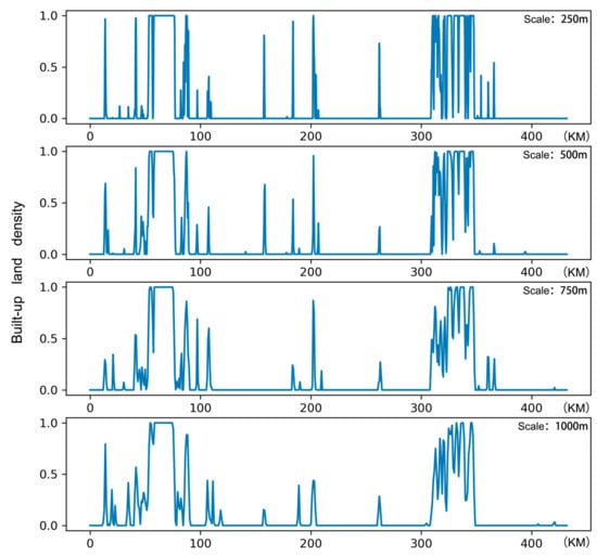 As shown in Table 2, the differences in C0 and C + C0 at different grid scales are small, so this study mainly focuses on the correlation coefficient and the nugget effect. Larger correlation coefficients and nugget effects indicate that the grid-scale is more applicable. Evidently, the grid scales of 250 m and 500 m are more suitable. Subsequently, we qualitatively examined the differences between different grid scales by extracting the built-up land density along the same transect. At 250 m grid-scale, the loss of original information is small, and the data redundancy is large (Figure 3); at 1000 m grid-scale, the data redundancy is small, and the original information loss is large; the 500 m and 750 m grid scales reduce data redundancy but also preserve the characteristics of the original information. Combining the results of quantitative and qualitative analysis, we finally decided to use 500 m as the grid-scale.