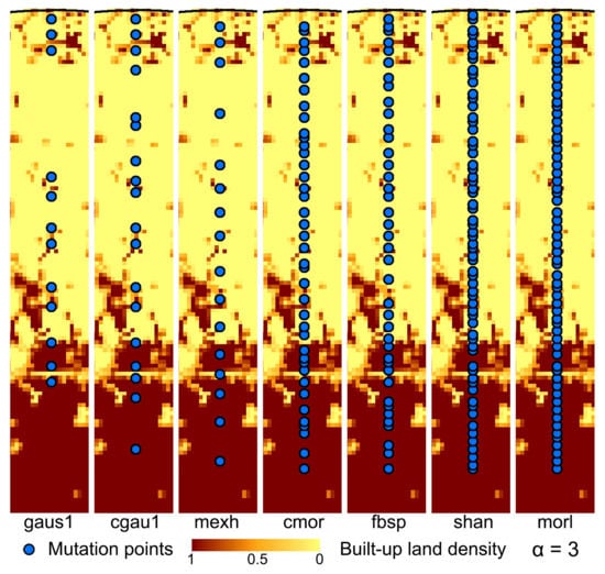 Regarding the selection of wavelet functions, we compared the mutation points extracted by seven wavelet functions on the same transect. Specifically, these were the Gaussian wavelet (gaus1), Mexican Hat wavelet (mexh), Morlet wavelet (morl), Complex Gaussian wavelet (cgau1), Shannon wavelet (shan), Frequency B-spline wavelet (fbsp), and Complex Morlet wavelet (cmor). Figure 4 reveals obvious differences in the results of mutation points extracted by different wavelet functions. Among them, the mutation point extracted by the gaus1-based spatially continuous wavelet transform is most consistent with the position where the density of the built-up land changes. Consequently, we selected gaus1 to detect mutation points.