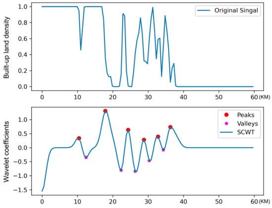 Process of spatially continuous wavelet transform (taking the built-up land density of the 216° transect as an example).