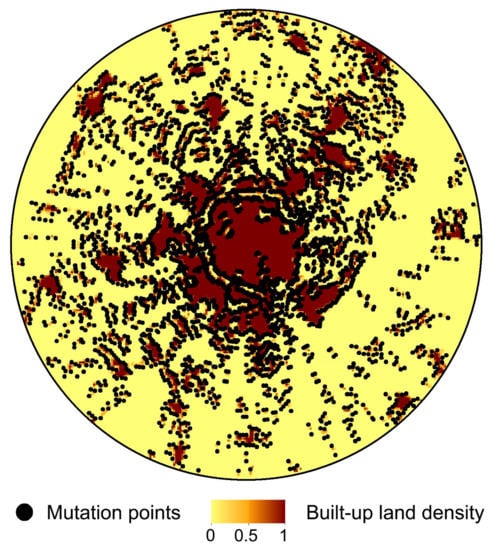 In Figure 7, urban and rural areas mostly do not contain mutation points. In this case, kernel density estimation can generate a density surface with boundary effects []. Therefore, we divided the inner and outer boundaries of UFAs by the kernel density estimation and carried out a reclassification. The calculation is shown in Equation (3):