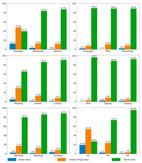 Based on the method proposed in this study, we identified the UFAs of each city in the Chengdu-Chongqing economic circle in 2020 and divided the city into three parts (referring to the urban area, UFA, and rural area in Figure 11) according to their inner and outer boundaries. Chongqing is a municipality directly under the central government. Furthermore, it belongs to the provincial administrative unit. Consequently, the districts and counties under the jurisdiction of Chongqing should belong to municipal administrative units. However, it is not reasonable to analyze the UFA according to the municipal administrative units, because the area of each district and county in Chongqing is not equal to that of other cities in the Chengdu-Chongqing economic circle. By considering the regional area and the development plan of Chongqing, we divided Chongqing into three parts: the main urban area (A1), the main urban new area (A2), and other areas (A3).