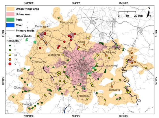 This study explored the spatial pattern of educational resources in two representative UFAs (UFAs of Chengdu and Chongqing). By using the density-field-based hotspot detector, we identified 117 hotspots in Chengdu and 224 hotspots in Chongqing. Then, we used the Jenks natural breaks classification method to divide hotspots into 5 levels (labelled I-V, representing small, medium-small, medium, medium-large and large educational resources hotspots, respectively) [,]. The specific information and spatial distribution are shown in Table 4, Figure 13 and Figure 14.