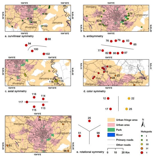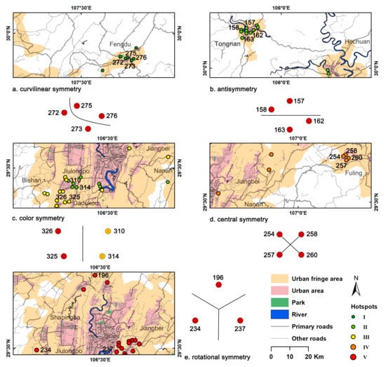 To facilitate analysis, we numbered the hotspots in UFAs of Chengdu from 1 to 117, and hotspots in UFAs of Chongqing from 118 to 341. Since there were many symmetrical structures, it was difficult to discuss all the structures. Hence, we selected some representative structures for analysis. Figure 15 and Figure 16 show the extraction results of the generalized symmetric structure Tupu for hotspots. The formation of the curvilinear symmetry structure (Figure 15a and Figure 16a) may be due to spatial heterogeneity; there are different natural conditions on both sides of the symmetry axis, such as mountains and rivers, which limit the balanced development of educational resources. The formation of antisymmetry structures (Figure 15b and Figure 16b) may be greatly affected by policy; this structure corresponds to the shape and trend of urban development. The formation of the color symmetry structure (Figure 15d and Figure 16c) is mainly controlled by the level of economic development, since the unbalanced development on both sides of the symmetry axis caused differences in the grades of hotspots. The formation of the axial symmetry structure (Figure 15c) and central symmetry structure (Figure 16d) shows that the traffic, terrain, and other conditions around the axis are similar. The rotational symmetry structure (Figure 15e and Figure 16e) reveals that the hotspots of the corresponding levels in the two regions are developing in three directions: north, southwest, and southeast. Combined with the distribution of other hotspots, it can be inferred that the driving force for the development of educational resources in a southwards direction is weak.