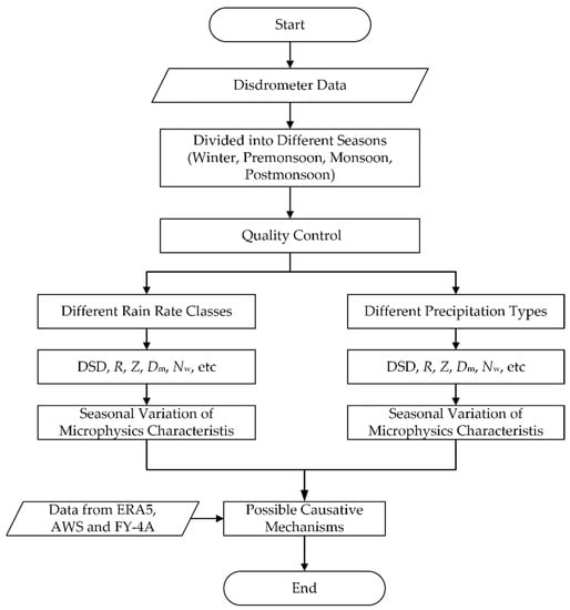 The proposed research investigation used different datasets to provide an overall evaluation of seasonal variation in raindrop size distribution in Mêdog. The main steps followed along this study are presented in the flow chart depicted in Figure 1.