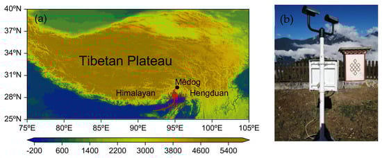 Measurements from a laser-optical PARSIVEL disdrometer [7] in Mêdog with a time resolution of 1 min were used in this study. The position of the Mêdog National Climate Observatory and a picture of the PARSIVEL disdrometer are shown in Figure 2. A disdrometer can simultaneously measure the size and falling speed of hydrometeors. The size and falling speed ranged from 0.06 mm to 24.5 mm and from 0.05 to 20.8 , respectively, which were divided into 32 nonequidistant bins [25,26].