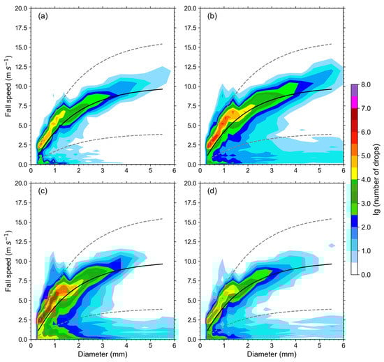 In this study, strict quality control was carried out on disdrometer data to eliminate the influence of raindrop classification errors caused by edge landing, strong wind and splashing. Firstly, the falling speed beyond the boundary of ±60% of Beard’s empirical speed–diameter relationship was excluded [27]. Given the terrain altitude of Mêdog, the speed–diameter relationship was corrected by multiplying by an air density factor of 1.04 [28]. Figure 3 gives the accumulated raw particle counts by diameter and fall speed observed during the four seasons. Drops beyond a ±60% empirical fall speed–diameter relationship were eliminated. The distribution of fall speed–diameter basically conformed to Beard’s empirical fall speed–diameter relationship after quality control.