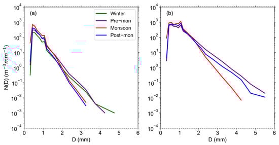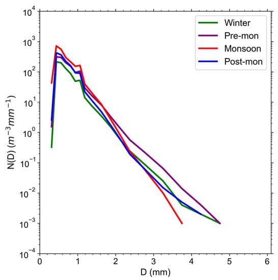 The maximum, mean and SD of Dm were found to be larger in the premonsoon season, which indicates stronger convective actions. During the monsoon season, the mean and SD of Dm were smaller, probably due to precipitation dominated by warm rain processes and the relative consistency of precipitation [3,24]. The maximum, mean and SD of NT were the highest in the monsoon season, which indicates that the raindrop concentration was the highest with larger dispersion.