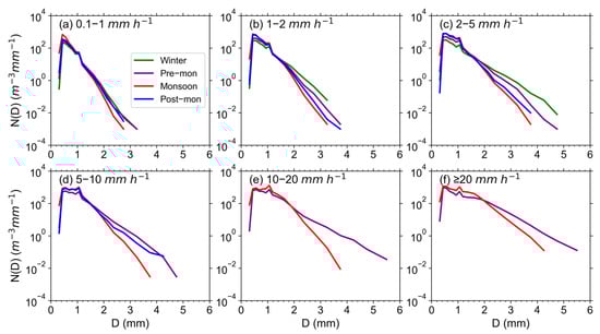 To further analyze the DSD characteristics in different seasons, the DSD data used in this study were divided into six categories, as shown in Table 2. The DSDs of different rainfall rate categories from mean spectra for different seasons are shown in Figure 5. As the rainfall rate increased, the spectra width in all seasons became wider, and the difference in DSDs among the four seasons gradually increased. For R ≤ 5 mm h−1 (usually corresponding to stratiform precipitation [13]), the concentration of large raindrops was the highest in winter. Precipitation with R ≥ 10 mm h−1 (usually corresponding to convective rainfall [36,37]) occurred mainly in the premonsoon and monsoon seasons. The concentration of large raindrops in the premonsoon season was significantly greater than that in the monsoon season, indicating stronger convective rainfall in the premonsoon season.