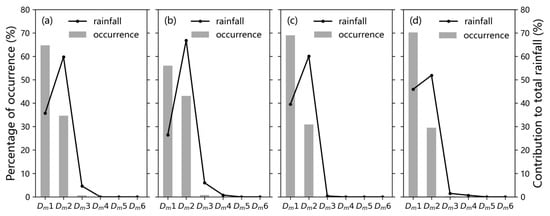 The distribution of the relative contribution to the rainfall totals was different from that of the occurrence frequency. The Dm2 category produced a greater contribution to rainfall by 50–70%, although it had a lower occurrence frequency than the Dm1 category. The rainfall rate was proportional to the third power of raindrop diameter. The larger raindrops with 2 ≤ Dm < 3 mm only contributed to the total rainfall by approximately 5% in the winter and premonsoon seasons, and there were hardly any larger raindrops with 2 ≤ Dm < 3 mm during the monsoon and postmonsoon periods.