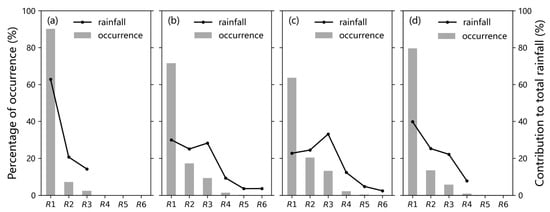 The percentage of occurrence (bar) and relative contribution to the total rainfall (line) from the different rain rate categories in the four seasons are shown in Figure 7. Weak rainfall with R < 1 mm h−1 was dominant in the four seasons, which was evident from the occurrence frequency of the R1 category exceeding 60%, especially more than 80% in the winter season. The occurrence frequencies of R2 and R3 were higher in the monsoon season than in the other three seasons. Considering the relative contribution to total rainfall, the relative contribution to rainfall by R1 was largest and exceeded 60% in the winter season. Similarly, the R1 category also made the largest relative contribution to rainfall in the postmonsoon season. However, the relative contributions to rainfall by the R1, R2, and R3 categories were comparable in the premonsoon season. During the monsoon season, the R3 category made the highest contribution to total rainfall, although its occurrence frequency was lower than that of the R1 and R2 categories.