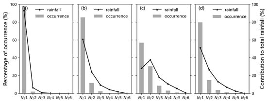 Figure 8 shows the percentage of occurrence (bar) and relative contribution to the total rainfall (line) from the different NT classes in the four seasons. The occurrence frequencies decreased with the increase in drop number, and the NT1 class predominated in the four seasons. The drop concentration in Mêdog was mostly below 250 m−3, followed by 250–500 m−3, and a drop concentration of more than 1000 m−3 rarely occurred. The occurrence frequency of NT1 was lower in the monsoon season (approximately 57%) than in the other three seasons (an average of approximately 88%), and the occurrence frequency of NT2 in the monsoon season (approximately 30%) was higher than in the other three seasons (an average of approximately 9.5%). The relative contribution to the total rainfall monotonically decreased with increasing NT in all seasons except the monsoon season. During the monsoon season, NT2 made a larger relative contribution (38%) to the total rainfall than the NT1 class (28%).