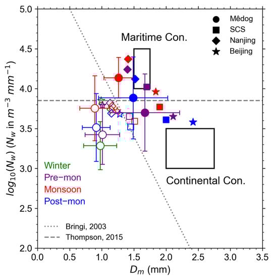Scatterplots of averaged log10(Nw) versus Dm (along with standard deviation bars) for stratiform (blank symbols) and convective (full symbols) precipitation in Mêdog (circles), SCS (squares), Nanjing (diamond) and Beijing (star) during the winter (green), premonsoon (purple), monsoon (red) and postmonsoon (blue) seasons. The two outlined squares represent (left) the maritime and (right) continental types of convective systems reported by Bringi et al. [34]. The dotted line and dashed lines represent the C–S separation line by Bringi et al. [34] and Thompson et al. [5].