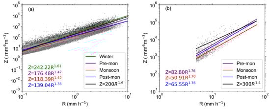 Considering the evident seasonal variation in DSD characteristics in Mêdog, the Z–R relationships for the four seasons are discussed in this section. Figure 12 shows the scatter plots of Z and R superimposed with the fitted Z–R relationships using the least squares method for stratiform rain and convective rain, respectively. The fitted coefficient A and exponent b for different rainfall types in the four seasons are given in Table 6. Following Zeng et al. [18], the normalized mean biases (NBs) of the fitted Z–R relations and empirical relations at midlatitudes for different precipitation types were calculated to evaluate the accuracies of different Z–R relationships (Table 7).