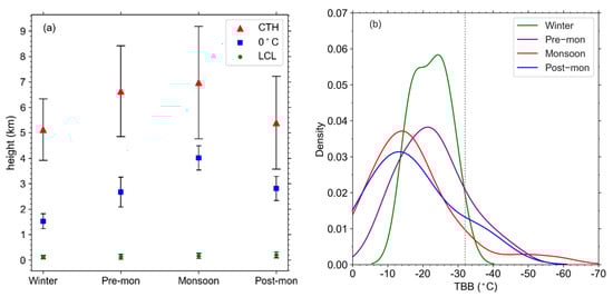 The lifting condensation level (LCL), 0 °C isotherm layer height, cloud top height (CTH) and standard deviation (a). TBB probability density function (b). The dashed line in Figure 13b denotes the TBB temperature of −32 °C.