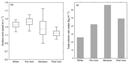 The postmonsoon precipitation had less rainfall total and was also characterized by a higher concentration of small drops (i.e., Figure 4 and Figure 5b–d). Although the mean depth of warm clouds (2.61 km) was similar to that of cold clouds (2.58 km) in this season, Figure 14 exhibits humid and weak wind atmospheric conditions, which are favorable to the production of small drops.