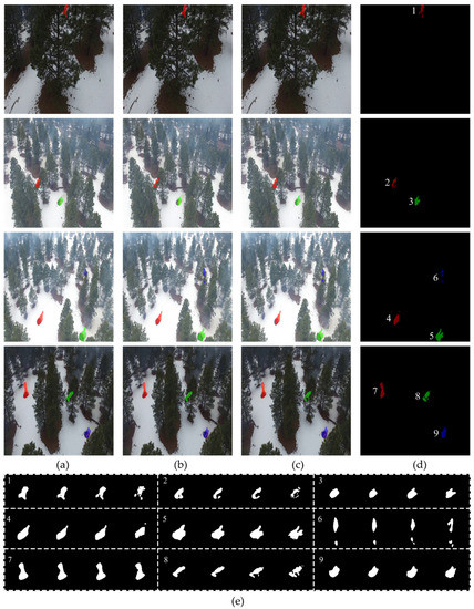 Predicted results of three different instance segmentation models: (a) mask R-CNN, (b) MS R-CNN, (c) our MaskSU R-CNN; (d) ground truth labels; and (e) segmentation details. Note that numbers 1 to 9 represent the order of fire points, and from left to right are the predicted results generated by Mask R-CNN, MS R-CNN, MaskSU R-CNN, and the corresponding ground truth label.