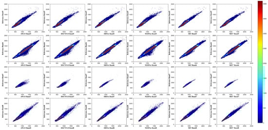 Compared with the scatter plot in Figure 7, it turns out that the inference results of bands 5 and 6 have larger areas of scattering compared to bands 7 and 8, which indicates that the reconstruction is less relevant. It is also reflected by the PSNR metric on Table 4. The larger the PSNR is, the smaller the scattering region and the strongest the correlation between the predicted band and the original one. The PSNR of band 7 in Table 4 is the highest, and the scatter region of band 7 in Figure 7 is the smallest. Therefore, we can conclude that the reconstruction accuracy of band 7 is the best. It can be seen from the scatter plot that the reconstruction accuracy of each band is different. Using MRAE as the loss function compared to RMSE can well avoid the training of the band-dominant model with large errors.