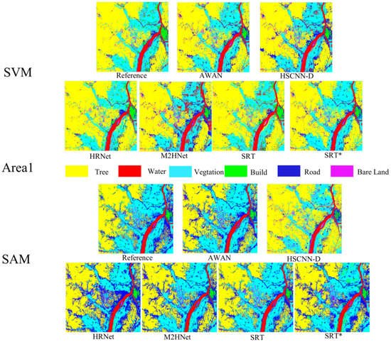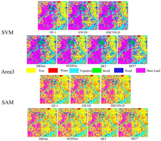 Table 4, Table 5, Table 6, Table 7, Table 8, Table 9 and Table 10 show that both the SRT and SRT* outperform other methods in terms of overall accuracy, which indicates that the TFEM has a significant advantage in performing spectral feature extraction. The SRT results are still the best in terms of SVM and SAM. By comparing the results of SRT and SRT*, we find that SRT needs to use RGM to prevent the model from losing some details during GF-1 PMS image inference. In addition, under the condition of the same samples, the classification result of SAM is lower than that of SVM. We think that the main reason is that the number of image bands used for classification is too small compared to hyperspectral images, which cannot exert the performance of SAM.