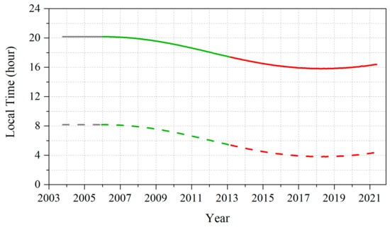 Variations of LECT at the ascending (solid curve) and descending (dashed curve) nodes of F16. Three time periods are also indicated: no available data (gray curve), high-quality data (green curve, from 20 November 2005 to 25 April 2013, and noisy data (red curves, from 25 April 2013 to 15 June 2021) in LAS channels TB observations.