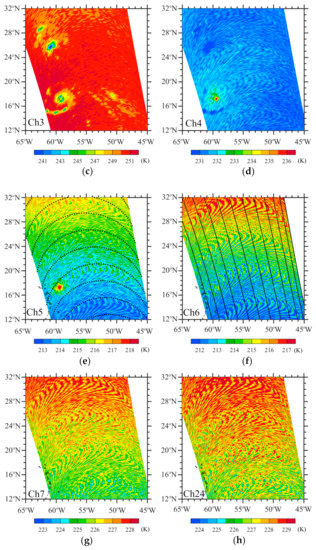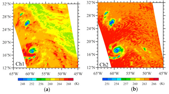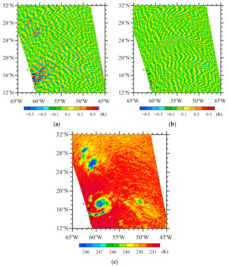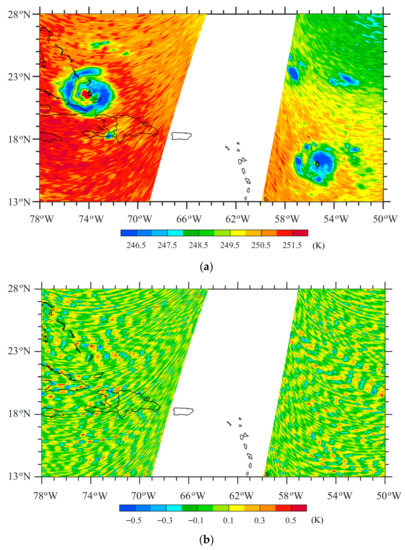 Figure 12a shows the SSMIS TB observations at LAS channel 3 for Hurricanes Irma and Jose; the latter appeared simultaneously with Irma over the Atlantic Ocean in September 2017. Since the detected noise of channel 3 is <0.5K (Figure 13b), the TB observations after the noise deduction look the same as Figure 13a, whose color interval is 0.5 K. At 0721 UTC on 8 September, Irma reached H4 intensity and Jose, the hurricane located to the southeast of Irma, was H3. At 0000 UTC on 8 September, the maximum sustained wind speed was 161 and 121 mph for Irma and Jose, respectively. The radius of 34-kt wind speed was 296 and 222 km for Irma and Jose, respectively. In Figure 13, the west swath captured the structures of Hurricane Irma, and the east swath revealed Hurricane Jose’s structure. A relatively large orbital gap exists between the two swaths. The hurricane eye is identifiable for both Irma and Jose. The observed TB values in the circularly distributed convective rainband regions are more than 6 K lower than those in their eyes, clear streaks between rainbands, and environments. The eye and rainband range of Irma are larger than those of Jose, with a fixed FOV size of 27 × 18 km2 at a fixed interval between the neighboring FOVs of 12.5 × 37.5 km2 (see Table 1). Such hurricane structures cannot be seen directly from TB observations of cross-track temperature sounders due to variations in their FOV size, spacing between two neighboring FOVs, and WF peak altitude along a scanline. Considering AMSU-A as an example, the altitude where the atmosphere contributes the most to an observed TB also increases with scan angle in the troposphere. Spacing between neighboring FOVs also increases with scan angle, and the across-track diameter of an FOV is 48 and 155 km at the nadir and swath edge, respectively [30]. Even the smallest AMSU-A FOV at the nadir is much coarser than the SSMIS FOV.