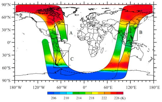 TB observations at channel 5 over two sequential swaths on 5 September 2017. One swath had its observation times from 1915 to 2057 UTC (edges indicated by a black solid curve) and the other swath from 2057 to 2238 UTC (edges indicated by a black dash curve). Three areas with 300 scanlines (black boxes) are also indicated: area A is at the ascending node over the western Northern Hemisphere, area B is at the descending node over the eastern Northern Hemisphere, and area C is at the ascending node over the western Southern Hemisphere.