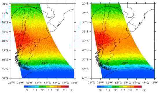 Two sequential SSMIS swaths are provided in Figure 3, which shows TB observations from channel 5 on 5 September 2017. The observation times for the swath whose edges are indicated by solid black curves were from 1915 to 2057 UTC; those for the other swath with edges indicated by black dashed curves are from 2057 to 2238 UTC. There are orbital gaps in low latitudes. The global TB observations vary more than 20 K, characterized by a significant latitudinal distribution. The TBs near the south pole are below 206 K, and those near the north pole are above 226 K. The TBs near the equator are around 214 K. It is difficult to see any noise structures in Figure 3 with more than a 20 K range of TB variations and 7 K color interval.