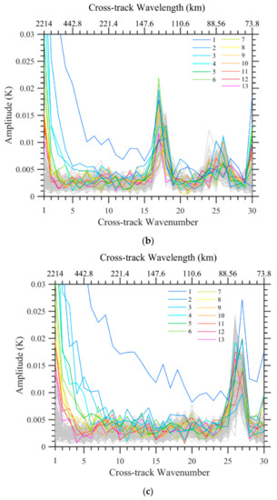 The regional dependence of data noise on across-track wavenumbers is further confirmed in Figure 8, which shows the along-track variations of 2D amplitude with respect to the cross-track wavenumber for TB observations over the two swaths in Figure 3. The across-track wavenumbers of larger amplitudes vary along both swaths compared with those of larger and smaller neighboring wavenumbers. We also found that variations of the across-track wavenumbers of data noise with respect to the observing latitude were the same for the two swaths. In other words, the F16 SSMIS LAS channels’ data noise depends on the latitude of the F16 orbit. Bell et al. [28] reported that solar intrusions into the warm calibration load affect the calibration accuracy for different parts of the orbit, and the thermal cycling of an orbit may also result in a modulation of the measured TB observations by the main reflector emission. The exact root cause for this noise pattern requires further investigation and is beyond the scope of this study.