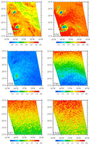 TB observations after noise reduction for channels 1, 2, 4, 6–7, and 24 on 5 September 2017. Hurricane Irma was located around 17.0°N, 59.7°W.