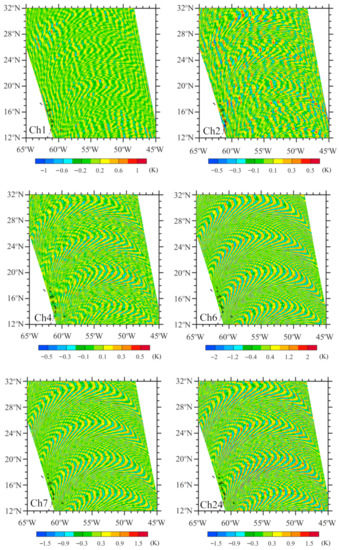 Figure 10 provides the spatial distribution of TB observations after noise reduction for the LAS channels 1–4, 6–7, and 24 over the same swath portion as Figure 2. The systematic curvy noise pattern seen in Figure 2 was successfully removed. What remains to be seen in TB observations besides weather signals are random errors, which are 0.4, 0.5, 0.6, and 0.7 for channels 4, 6, 7, and 24 (see Table 1). The noise detected for channels 1–4, 6–7, and 24 (Figure 11) have a curvy pattern, as seen in TB observations (Figure 2).