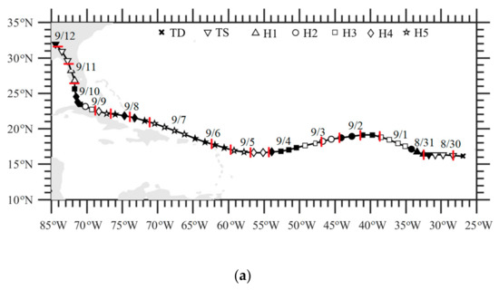 (a) The best track (black markers) of Hurricane Irma from 0000 UTC on 30 August to 0000 UTC on 12 September 2017. Different markers indicate intensity categories. The solid and hollow markers indicate different days. Red markers indicate the SSMIS observation time. (b,c) Temporal evolution of the vertical variations in SSMIS temperature anomalies at Irma’s center (b) before and (c) after noise reduction from 1800 UTC on 30 August to 0000 UTC on 11 September 2017. (d) The detected noise. The times when Hurricane Irma’s center was located within SSMIS swaths are indicated by short red lines in (a) and black dashed vertical lines in (b–d).
