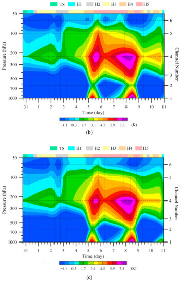 Being sensitive to the atmosphere in the lower altitudes of the middle and lower troposphere than other LAS channels in the upper troposphere and stratosphere, TB observations of LAS channels 1–4 were more strongly affected by cloud and precipitation. Figure 9 provides an example of channel-3 noise extracted by the same method as channel 5 (, Figure 9a). The noise was extracted by adding a step to avoid the impacts of heavy precipitation-induced TB outliers of abnormally small value on the 2D spectrum (, Figure 9b), and the reconstructed channel-3 TB observations (i.e., ) at the ascending node on 5 September 2017 (Figure 9c). The noise extracted by the same method as channel 5 (Figure 9a) was not homogeneously distributed in space, with large magnitudes in places of abnormally low TB observations. After adding a step to avoid the impacts of heavy precipitation-induced TB outliers, the noise extracted by the same method as channel 5 (Figure 9b) was homogeneously distributed in space and resembled those of the upper-level channel 5 (right panels in Figure 4).