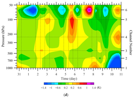 As Hurricane Irma moved along its best track and the intensity changed (see Figure 14a), the vertical structure also changed, as indicated by TB observations at Irma’s center from 30 August to 11 September 2017 (Figure 14b,c). The detected noise was less than 1.2 K (Figure 14d). Here, the TB anomaly is defined as the TB observations subtracted by the mean environmental temperature within a latitude–longitude geographic box centered at the same latitude of the hurricane center but away by 1000 km. Irma’s warm core was maximized at about 250 hPa. As Irma’s intensity increased from 31 August to 5 September 2017 (see Figure 1b in Tian and Zou [22]), the TB warm-core depth and intensity continually increased from 5 September to 8 September, during which Irma was an H5 hurricane. We noticed that the warm core extended to the surface around 0805 UTC on 5 September and 0910 UTC on 8 September due to Irma’s large clear eye, as shown in Figure 13 and Figure 14 for the 0910 UTC on 8 September. Such useful information is difficult to obtain by AMSU-A TB observations or warm-core temperature retrieval due to the AMSU-A’s inability to resolve hurricane eye adequately.
