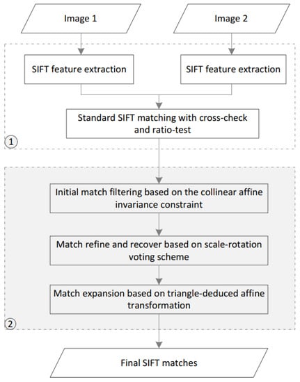 Initial matches are established by using the classical workflow of local feature matching. Considering the high computational costs in scale pyramid construction and feature descriptor comparison, the GPU (graphics processing unit) accelerated SIFT algorithm, termed SIFTGPU [], has been utilized in this study to detect and match features. Due to geometric and photometric deformations, and the only usage of local appearances for descriptor generation, false matches have inevitably existed in initial matches. After the establishment of initial matches, false matches are then filtered based on the CAI geometric constraint. The basic idea of the CAI geometric constraint is that the collinearity of inliers is invariant under an affine transformation, which would be used to calculate the similarity score of initial matches, as illustrated in Figure 2.