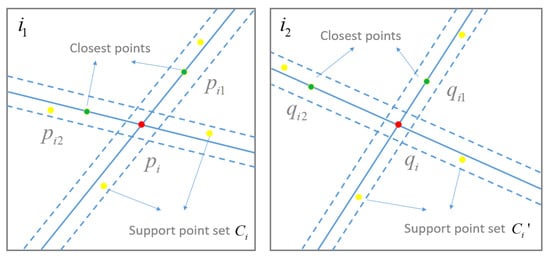 Suppose that feature points P and Q are detected from two input images and , respectively; n initial matches are obtained and indicated as with and . For each initial match , the similarity score is then calculated according to the CAI geometric constraint. For the target feature points in image , its K closest feature points are first searched from matched feature points of image . Then, a straight line is constructed by connecting the target feature point and one of its closest feature points . After the buffering operation on the straight line by using the buffer threshold , the search region around the straight line can be formed, and all matched feature points within the search region are labeled as the support point set between points and . Therefore, for the K closest feature points in , the union of the support point set is defined as the support point set of the target feature points . Similarly, the K closest feature points of the corresponding point in image can be directly determined according to the relationship of initial matches, and the support point set of the corresponding point can be found by using the same operation. Based on these two support point sets and , the similarity score of the initial match is defined by Equation (1)