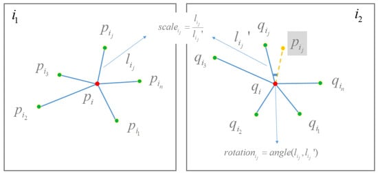 Suppose that the refined matches are generated based on the CAI geometric constraint; for one target match , its neighboring match can be found under the constraint that is the neighbor of , and is the neighbor of . Two lines and can then be created by connecting one target feature point with its neighboring feature points, i.e., connects and ; connects and . Thus, the scale change from feature point to is defined as the length ratio of lines and by Equation (2)