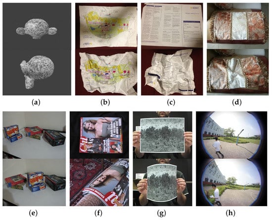 Figure 5. (a–h) The rigid dataset (close-range dataset 2). - The third dataset includes 8 image pairs that have non-rigid deformations, such as blend and extrusion, as shown in Figure 6. For the used three datasets, the first and second datasets have the ground-truth transformation between image pairs, such as the homography matrix for the first and the other images in each image sequence. For these two datasets, the provided model parameters have been used to separate inliers from initial matches. In this study, the matches with the transformation errors that are less than 5 pixels are defined as inliers. For the third dataset, we have prepared ground-truth data through manual inspection.