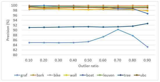 The robustness to varying outlier ratios is a very critical characteristic for outlier removal which influences the validation and performance of outlier-removal algorithms. In this section, we analyze the robustness to outliers for the proposed algorithm. Similar to Section 3.2, the first dataset (close-range dataset 1) has been used for this test. To prepare image pairs with specified outliers, inliers are first identified by using the ground-truth transformation, and a specified number of the remaining feature points are randomly added into the inliers to create matches with the specified outlier ratio. In this test, the outlier ratio ranges from 0.1 to 0.9 with an interval value of 0.1, and match expansion in the third step is not performed.