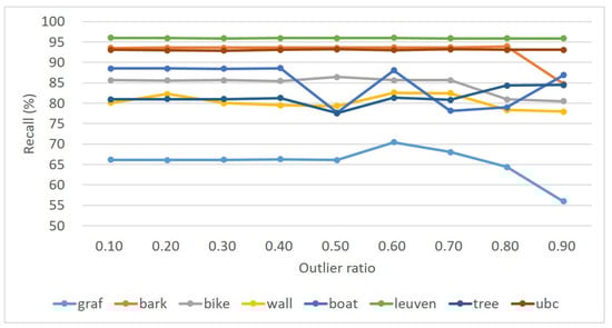 For performance evaluation, the average precision and recall of five image pairs are calculated for each image sequence. Figure 9 and Figure 10 present the statistical results of precision and recall, respectively. The experimental results show that the precision is almost constant with the increase of outlier ratios, and high precision has been achieved for the eight image pairs. Even when the outlier ratio reaches 0.9, the precision is still greater than , except for the image pairs graf and tree, as shown in Figure 9. By observation of the metric recall as shown in Figure 10, we find that a similar trend can also be observed with an increase of outlier ratios from 0.1 to 0.9. That is, the recall is almost constant for the eight image pairs, except for image pairs graf and tree. In addition, these image pairs can be divided into three groups. The first group includes image pairs bark, leuven and ubc, whose recall is approximately 0.95; the second group consists of image pairs bike, wall, boat and tree, whose recall ranges from 0.8 to 0.9. In conclusion, the proposed outlier-removal algorithm can achieve stable precision and recall under varying outlier ratios; the precision is very high even under the outlier ratio with the value of 0.9.