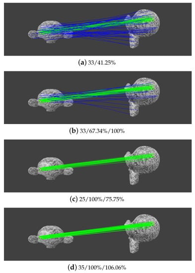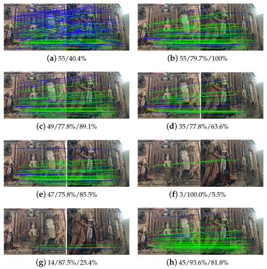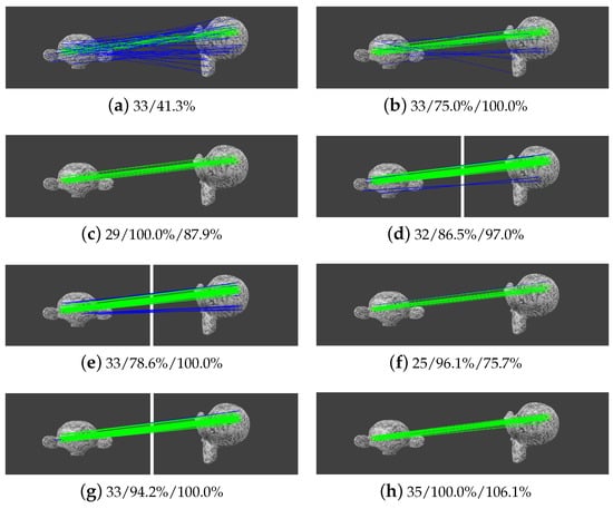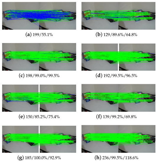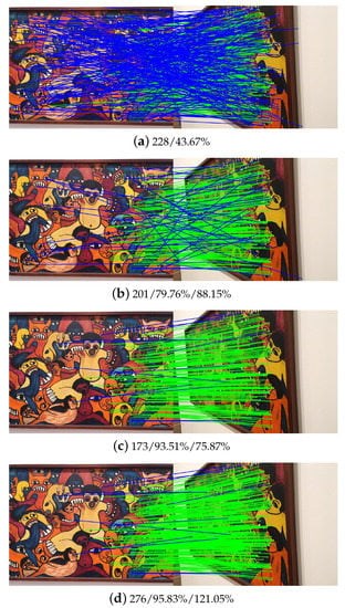 For the rigid case, as shown in Figure 11, the results of the four steps are presented in Figure 11a–d, respectively. For initial matches, there are 228 inliers with a precision of 43.67%. After the execution of the CAI constraint, 201 inliers are retained with a recall of 88.15%, and the precision increases to 79.76%. As shown in Figure 11b, a large proportion of outliers have been removed, which are rendered in blue lines. SOV is then conducted to further refine the matches, and the precision increases to 93.51%. In this step, 173 inliers are retained with a recall of 75.87%. Although some inliers are lost in the collinear constraint and the scale-orientation voting, match expansion is executed to resume falsely removed inliers at last. In this case, a total number of 276 inliers are retained with a precision value of 95.83%, as shown in Figure 11d.