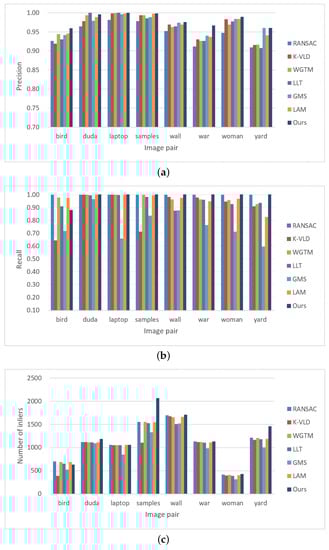 In this section, the proposed algorithm is compared with the other methods, including RANSAC, K-VLD (K Virtual Line Descriptor), WGTM (Weighted GTM), LLT (Locally Linear Transforming), GMS (Grid-based Motion Statistic), and LAM (Locality Affine Invariant). K-VLD adopts the virtual line descriptor as the local photometric constraint to detect false matches []; WGTM is the classical outlier-removal method based on graph matching []; LLT is based on the local geometric constraint that is invariant between rigid and non-rigid image pairs []; GMS uses the motion smoothness constraint to translate feature number to match quality []; LAM depends on the local barycentric coordinate (LBC) and matching coordinate matrices (MCMs) for outlier removal []. In this comparison, the outlier ratio of initial matches is greater than 60%.