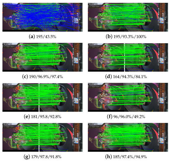 Matching results of image pair 8 in the rigid dataset: (a) initial matches; (b) RANSAC; (c) K-VLD; (d) WGTM; (e) LLT; (f) GMS; (g) LAM; (h) Ours.