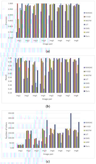 For comparative performance evaluation, three criteria, namely precision, recall and inlier number, are utilized as measurements. Precision is the ratio of the numbers of inliers and total matches generated from the proposed algorithm, as presented by Equation (4); recall is the ratio of the number of inliers to the number of total inliers in the ground-truth data, as shown by Equation (5); inlier number is the total number of true matches that are generated by outlier-removal methods.