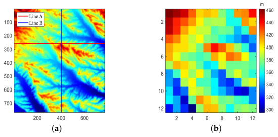 However, it is not clear whether the VEDA is effective for L-band data, because only the real measurement data of the P-band are verified in [19]. To address this issue, an example with NASA/JPL airborne L-band PolSAR data from Camp Roberts is presented, as shown in Figure 2. The pixel size in the azimuth and ground range directions is 10 m. The DEM generated by C-band InSAR of the corresponding area in Figure 2a is shown in Figure 3a, which shows the roughness of the terrain.