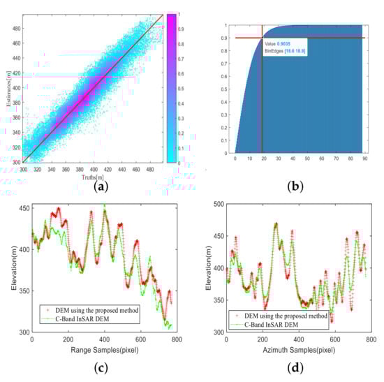 Further, the differences between the PolSAR-derived DEM and the C-band AIRSAR InSAR-derived DEM were deeply analyzed. The scatter plot of the DEM maps obtained from the overall InSAR, as the ground truth value, and PolSAR data is shown in Figure 8a. The cumulative distribution function of the elevation difference is shown in Figure 8b and we can see that 90.35% of the points have an elevation difference of less than 18.9 m. Two profiles were extracted from C-band InSAR DEM and L-band PolSAR DEM along lines A and B in Figure 6a; the comparison results are presented in Figure 8c,d. The overall trend of elevation change is the same, but it can be found that the error is greater in steep areas, which can be obtained by combining the profile at the intersection of lines A and B.