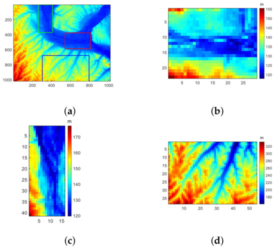 For further analysis, three regions of interest (ROI) are selected, as shown in Figure 12a, and the tie-points are shown in Figure 12b–d with a resolution of 90 m. The red (ROI1)- and green (ROI2)-marked areas correspond to relatively flat terrain in different directions and the blue (ROI3)-marked areas correspond to relatively steep terrain.