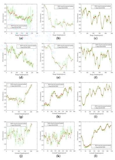 Moreover, the elevation profiles marked by line A–line D in the three ROI regions were extracted, as shown in Figure 14. Combining line A and line D in Figure 13a and line A, line B, and line D in Figure 13e, it can be seen that the poor estimation results in a, j, b, e, and k in Figure 14 are due to the fact that these profiles all span multiple terrains.